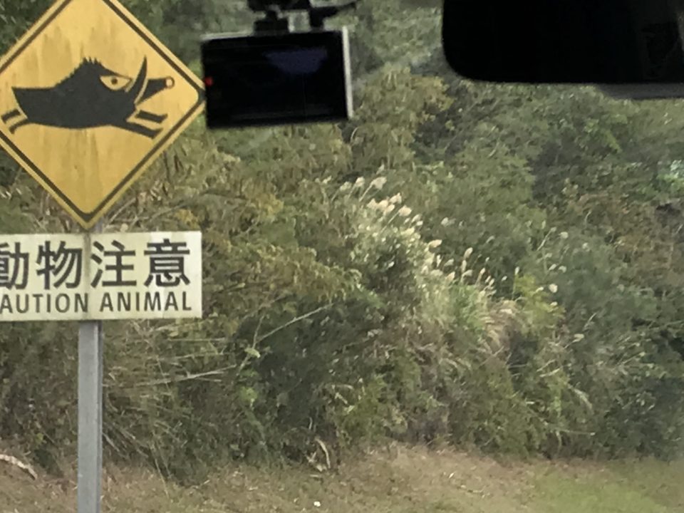 高速道路を沖縄市方面に走っている中で、動物注意の標識がありました。見ると、イノシシ。