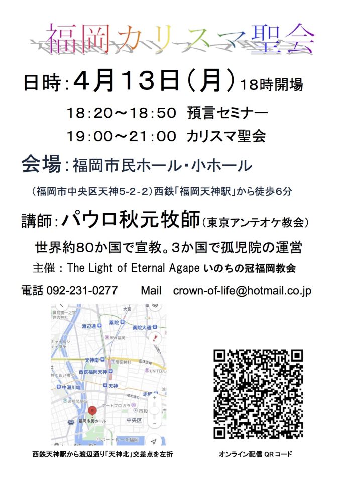 もうすぐ福岡カリスマ聖会 2026年4月13日 17:39 / faith9 神さまに期待します♪ オンライン配信します♪ 福岡 yurika 未分類 過去の投稿へ 祝福のポイントは何か? 次の投稿へ 預言セミナー